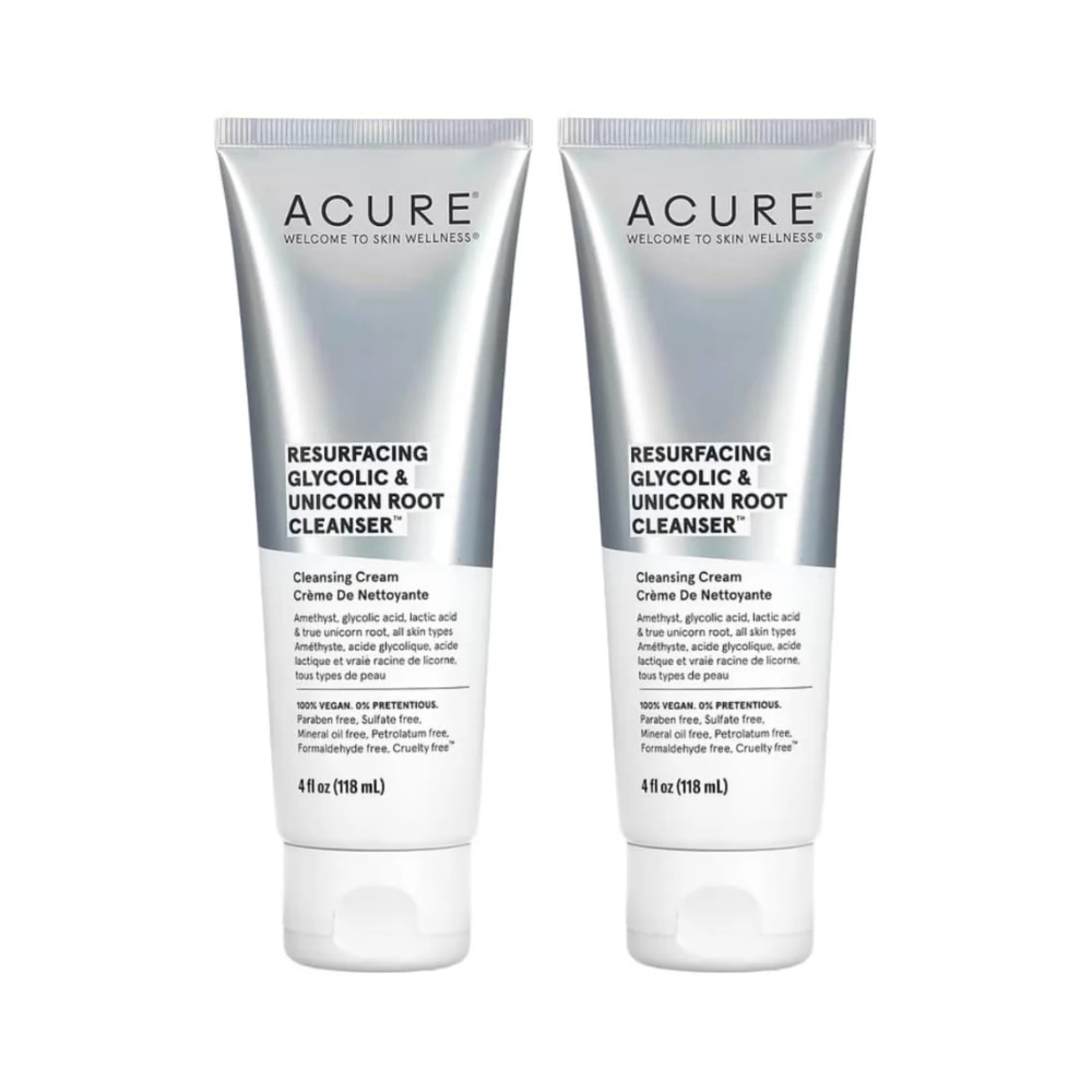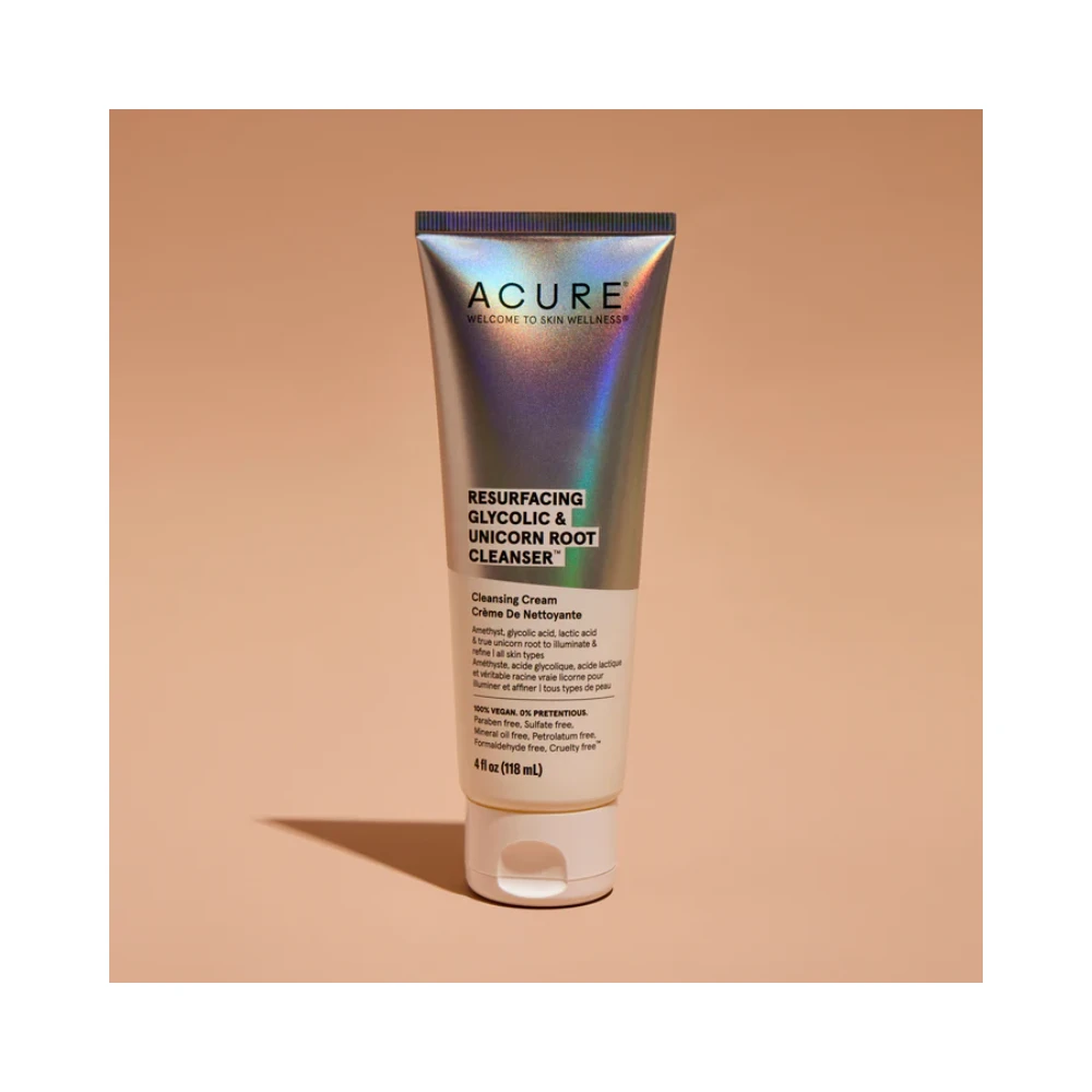 ACURE’s AHA Resurfacing Glycolic & Unicorn Root Cleanser refines pores and deeply hydrates to reveal bright and glowing skin.