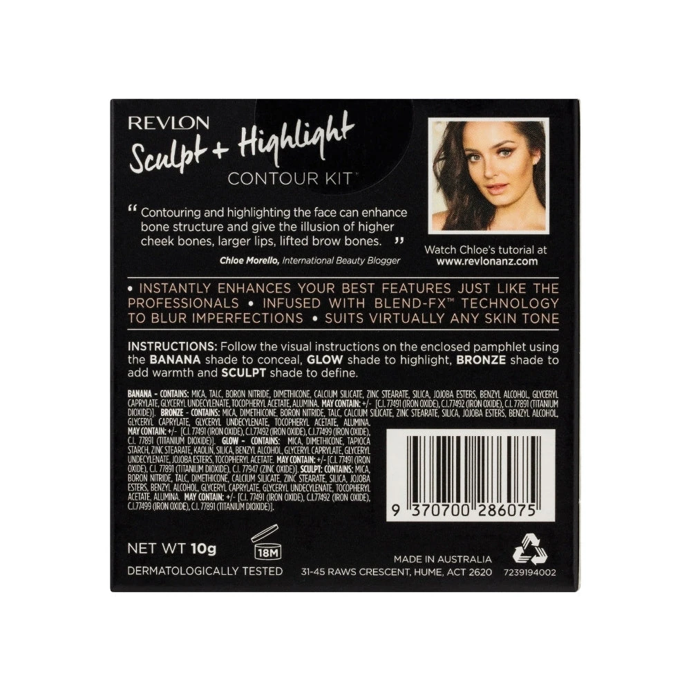 The Revlon Sculpt and Highlight Contour Kit with four shades makes contouring simple. The light diffusing pigments, BlendFX technology and silky, light weight powder will help you create a natural, sculpted look in minutes. Revlon Sculpt & Highlight Contour Kit in Medium/Tan is co-developed with Chloe Morello, an International Beauty Blogger. Instantly enhances your best features just like the professionals. Contouring and highlighting the face can enhance bone structure, give the Illusion of higher cheek bones, larger lips and lifted brow bones.