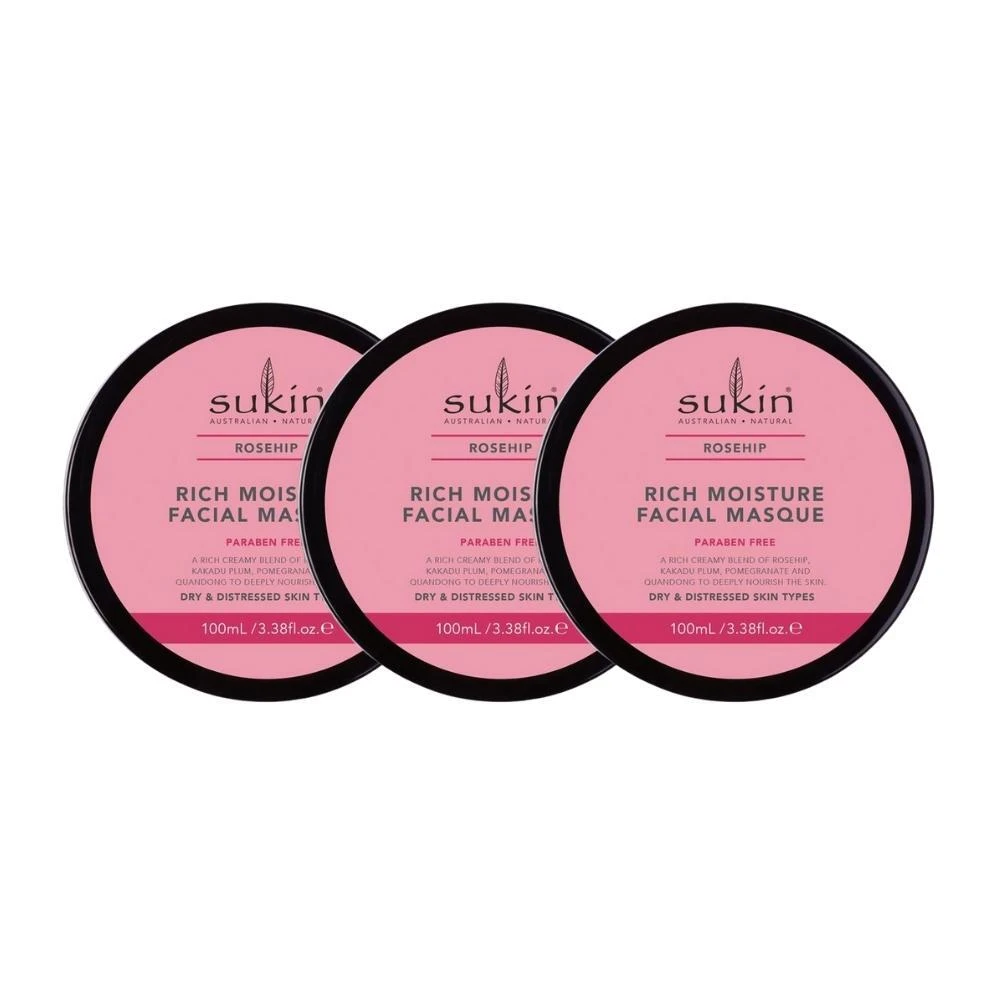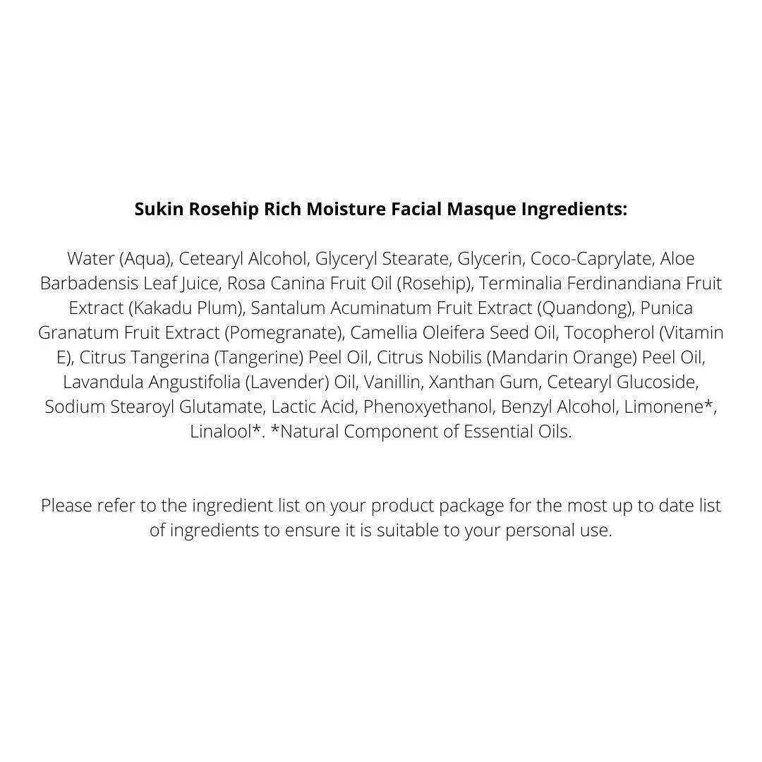 Sukins cream-based masque is richly hydrating with Rosehip, Kakadu Plum and Quandong to support even the driest of skin types. Formulated with Vitamin E, Aloe Vera, and Pomegranate to nourish and restore skin vitality.