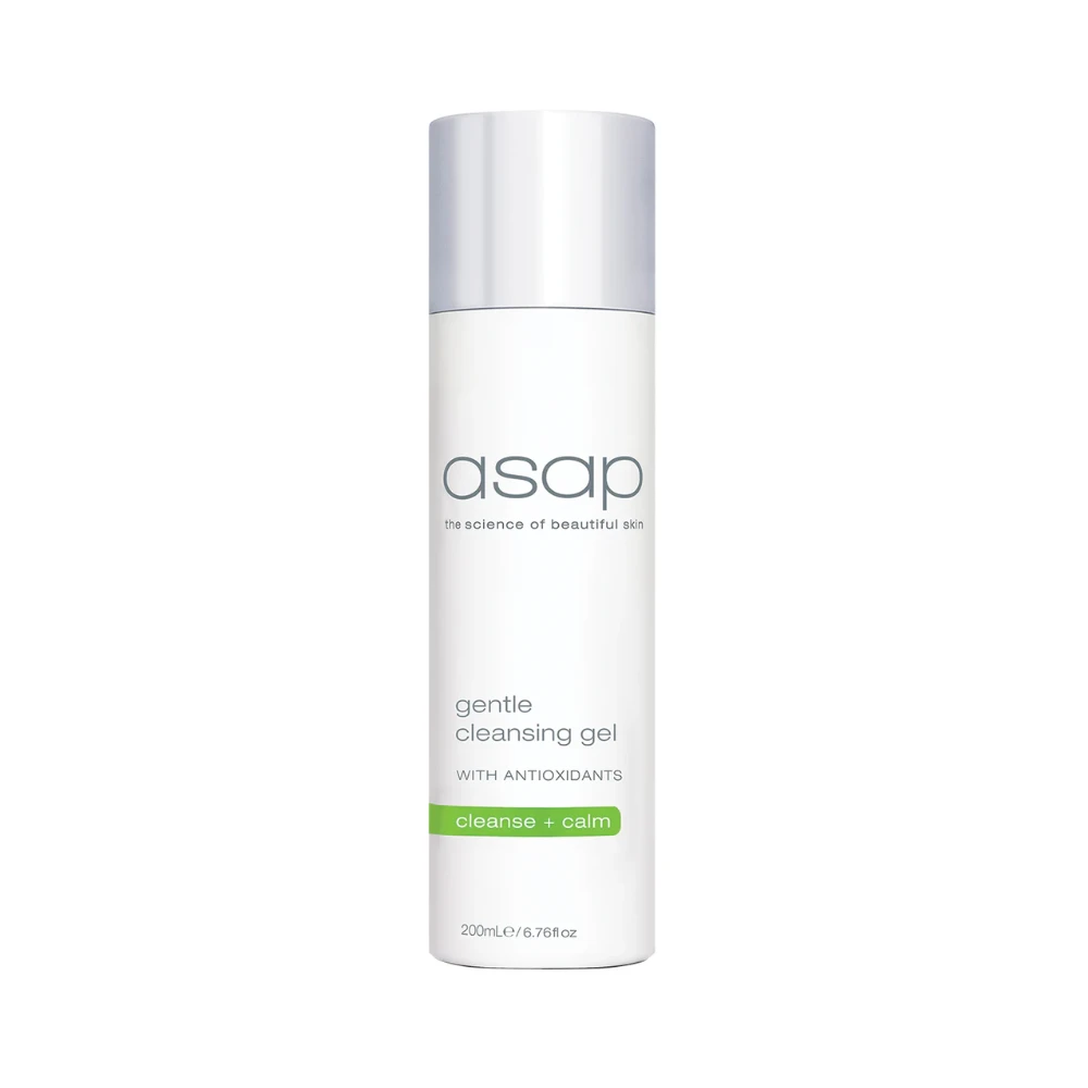 The asap Gentle Cleansing Gel is a soap-free cleanser that is formulated to gently and thoroughly cleanse the skin from makeup and daily build-up without irritating the skin. The light-lathering, soap-free formula is safe for sensitive, rosacea-prone skin and leaves the skin feeling clean and calm.