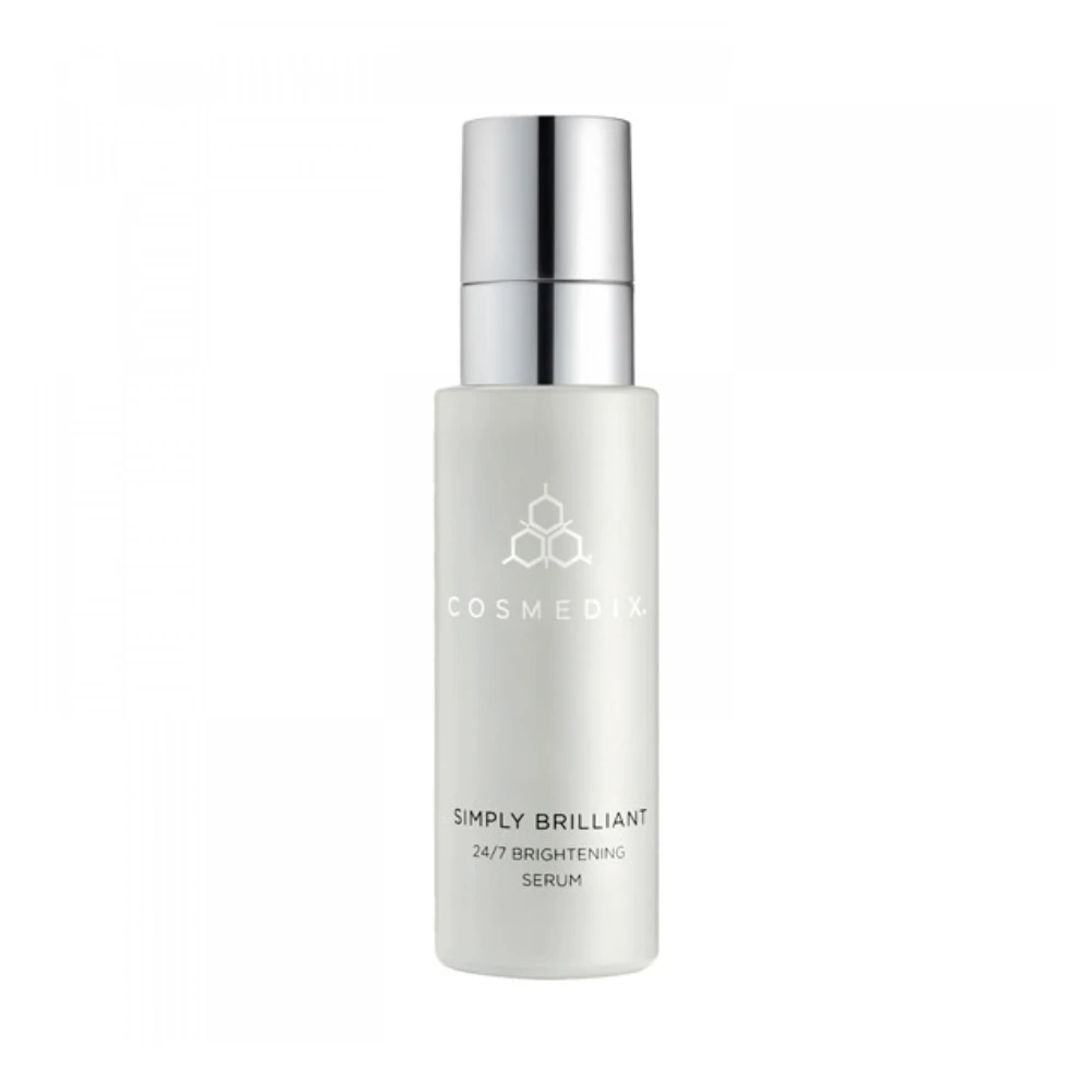 Cosmedix Simply Brilliant 24/7 Brightening Serum contains ten very specific brightening ingredients that work to fight dull, discoloured and uneven skin tone. Lactic and salicylic acids refine texture and improve penetration of the brightening ingredients.