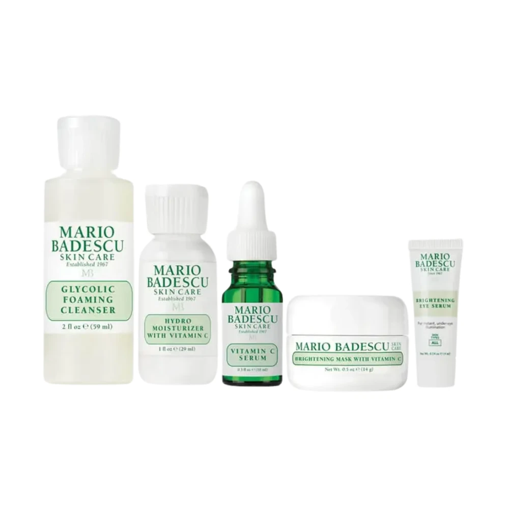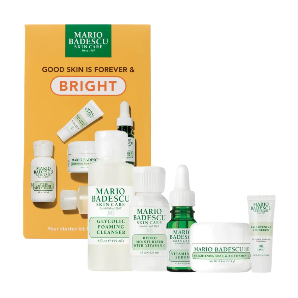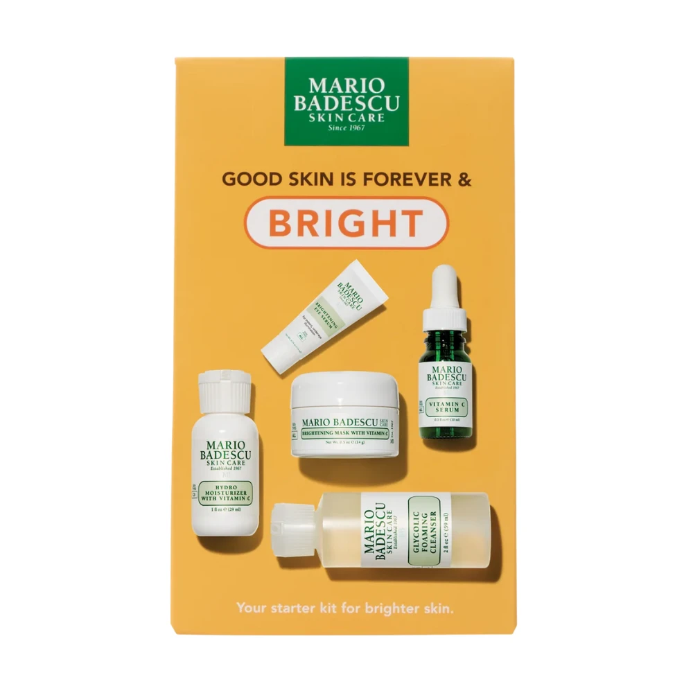 The Mario Badescu Good Skin Is Forever & Bright Kit is a skincare set with all the basics, designed to brighten and even out skin tone. Featuring products like the Glycolic Foaming Cleanser, Vitamin C Serum, and Brightening Mask, it combines exfoliating and antioxidant-rich ingredients to enhance radiance and reduce dullness. This kit offers a targeted approach for achieving a glowing, more youthful complexion.