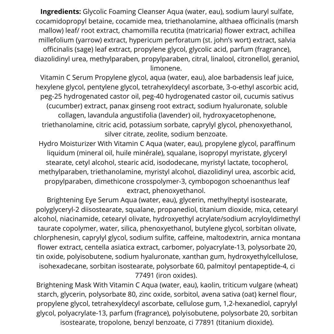 How to use: In the morning, start by applying a pump of Brightening Eye Serum to your ring finger and gently press it along the orbital bone, including the eyelids. Follow with Hydro Moisturizer with Vitamin C after cleansing, toning, and applying eye cream, avoiding the eye area. For an extra boost, use the Brightening Mask with Vitamin C 2 to 3 times a week after cleansing, applying an even layer and letting it dry for 5 to 10 minutes before rinsing.
