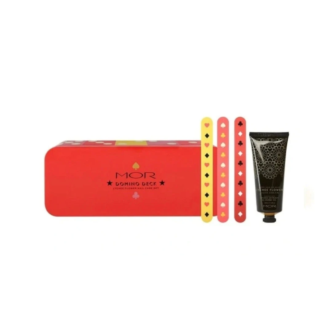 Experience the enchanting allure of the MOR Lychee Flower collection with this elegantly curated Domino Deck Nail Care Set. Housed in a collectible, decorative domino-inspired tin, this set provides the ultimate duo for hand and nail maintenance, combining luxurious hydration with practical grooming tools.