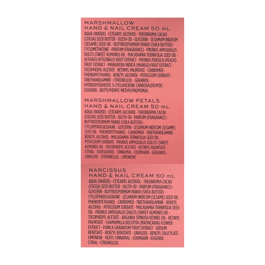 - Set Includes: 1 x Marshmallow Petals Hand & Nail Cream (50mL), 1 x Marshmallow Hand & Nail Cream (50mL), 1 x Narcissus Hand & Nail Cream (50mL)