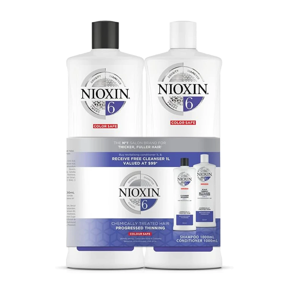 The Nioxin System 6 Duo is a specialized professional treatment formulated for hair with progressed thinning that has been chemically treated. This comprehensive kit delivers smoothing control while shielding the scalp and restoring a healthy moisture balance, providing a foundation for thicker-looking, resilient hair.