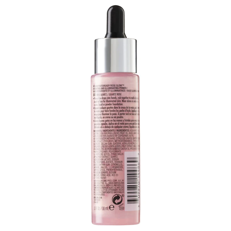 Revlon PhotoReady Rose Glow Hydrating and Illuminating Primer is a water-based primer infused with encapsulated oil beads, luminous quartz, and skin conditioning extracts for a dewy finish. Use to prep your skin for easy foundation application. Your skin will feel moisturized and radiant for up to 24 hours.