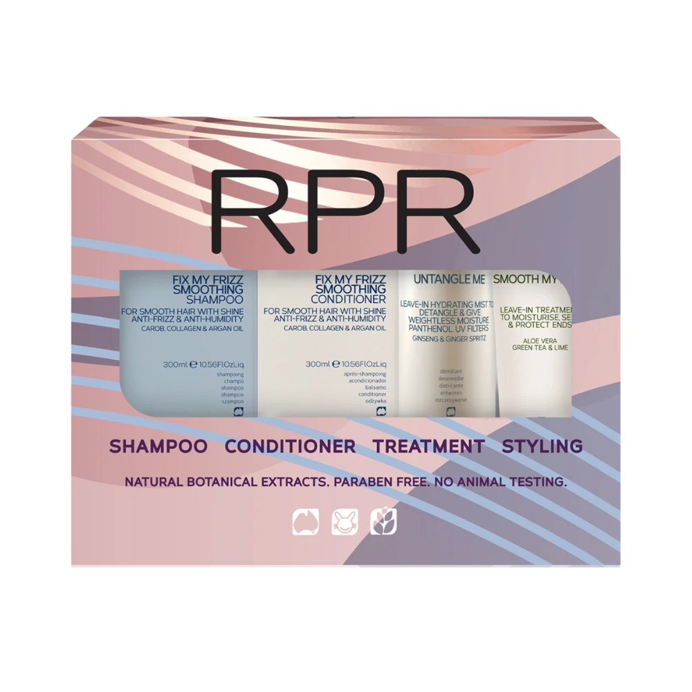 The RPR Fix My Frizz Quad Pack helps to smooth hair, add shine and fight against frizz and humidity.