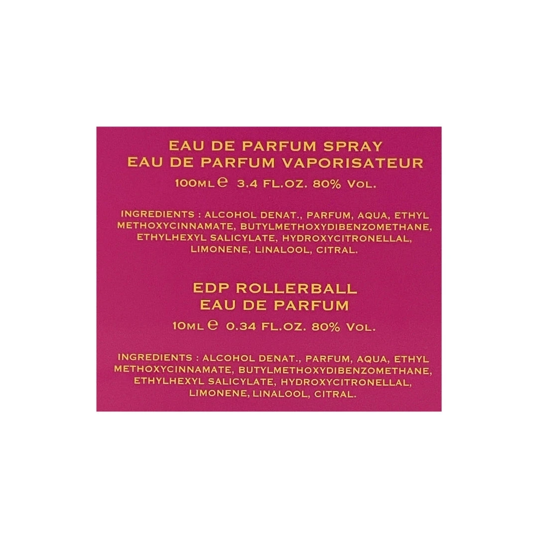 - Set Includes: 100mL Eau de Parfum (EDP), 10mL Rollerball EDP