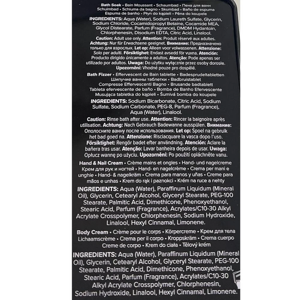 - Set Contents: 50mL Body Cream, 50mL Hand & Nail Cream, 50mL Bath Soak, and 25g Bath Fizzer.